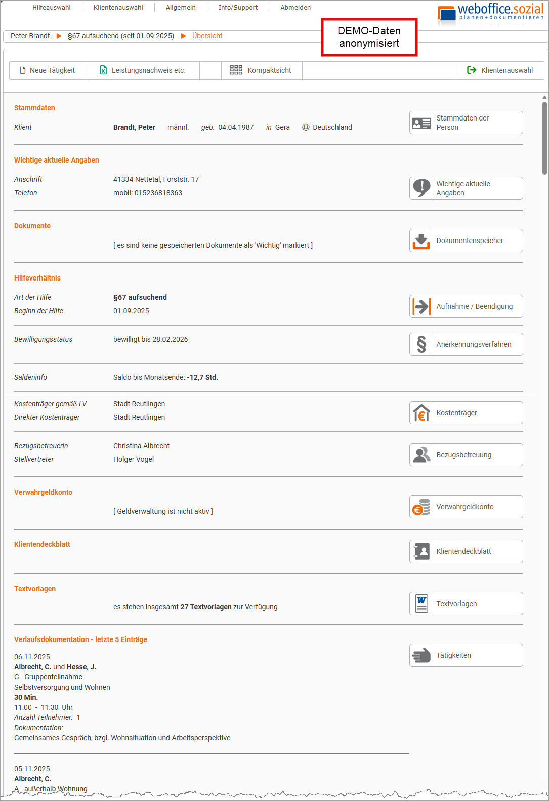 Nach dem weboffice.sozial Login wählt der Anwender einen Klienten aus und gelangt damit direkt zum Dialog Übersicht der Klientendokumentation - hier ein Beispiel: