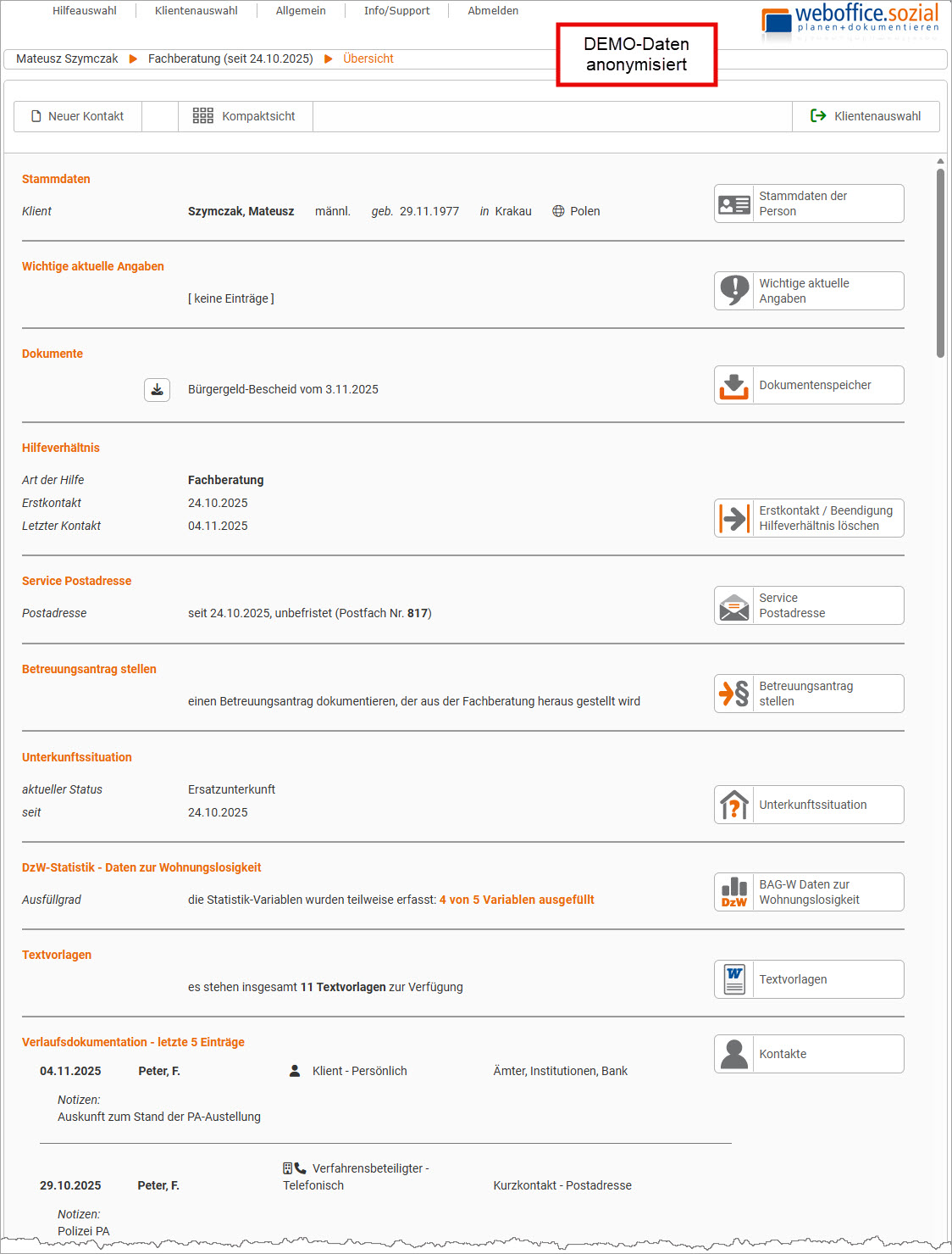 Nach dem weboffice.sozial Login wählt der Anwender in der Fachberatungsstelle einen Klienten aus und gelangt damit direkt zum Dialog Übersicht der Klientendokumentation - hier ein Beispiel: