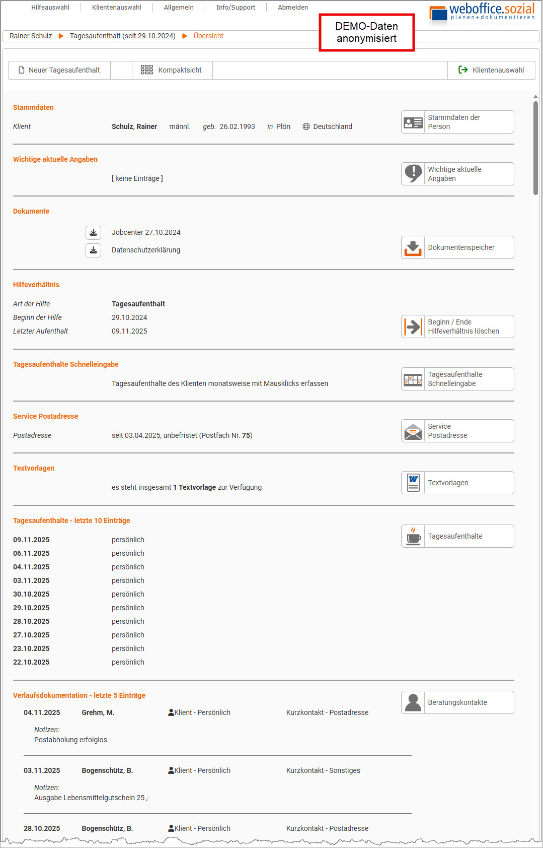 Nach dem weboffice.sozial Login wählt der Anwender im Tagesaufenthalt einen Klienten aus und gelangt damit direkt zum Dialog Übersicht der Klientendokumentation - hier ein Beispiel: