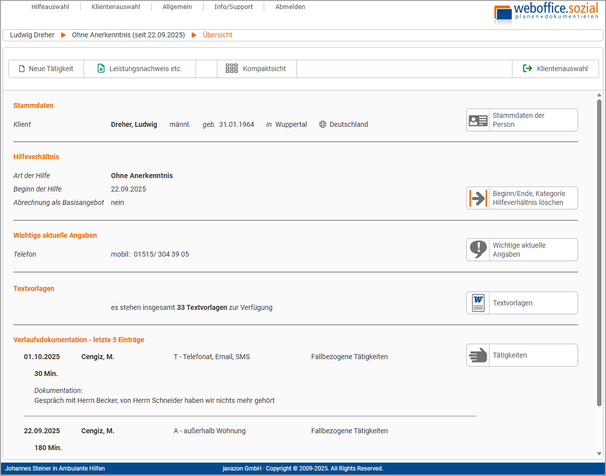 Nach dem weboffice.sozial Login wählt der Anwender einen Klienten aus und gelangt damit direkt zum Dialog Übersicht der Klientendokumentation - hier ein Beispiel: