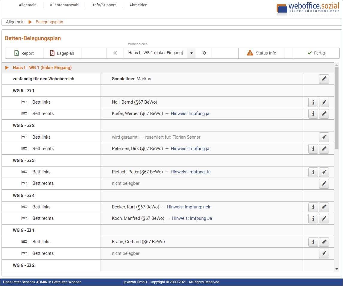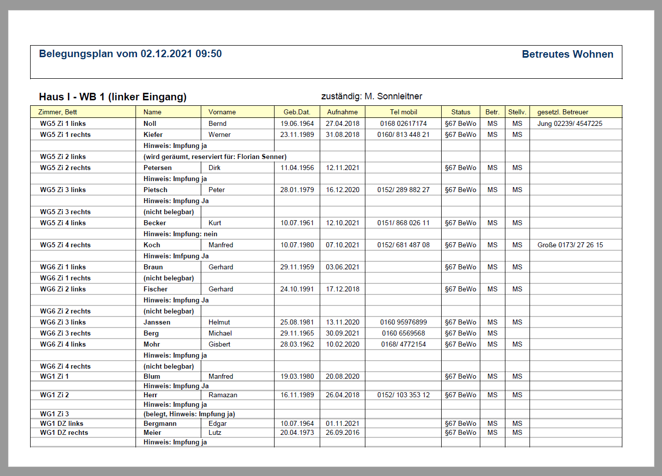 Der Beispiel-Screenshot stammt aus einer großen Einrichtung und zeigt die erste Seite eines mehrseitigen Reports, der in diverse Wohnbereiche untergliedert ist.