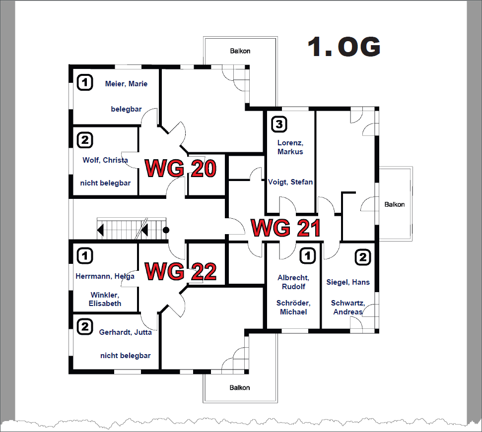 Das Beispiel stammt wieder aus einer großen Einrichtung, die sich über mehrere Stockwerke und zwei Gebäude erstreckt. Abgebildet ist ein Auszug aus einem mehrseiten pdf-Dokument, das die gesamte Belegung der Einrichtung räumlich dokumentiert.