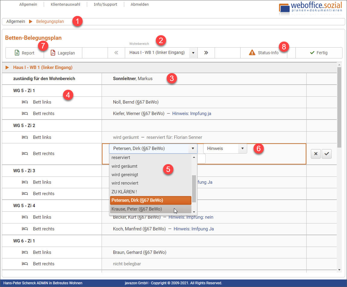 - Klickt der Benutzer auf eine der Bleistift-Schaltflächen, kann er die entsprechende Belegung bearbeiten. Ersatzweise können auch Status-Infos wie "wird desinfiziert" ausgewählt werden.